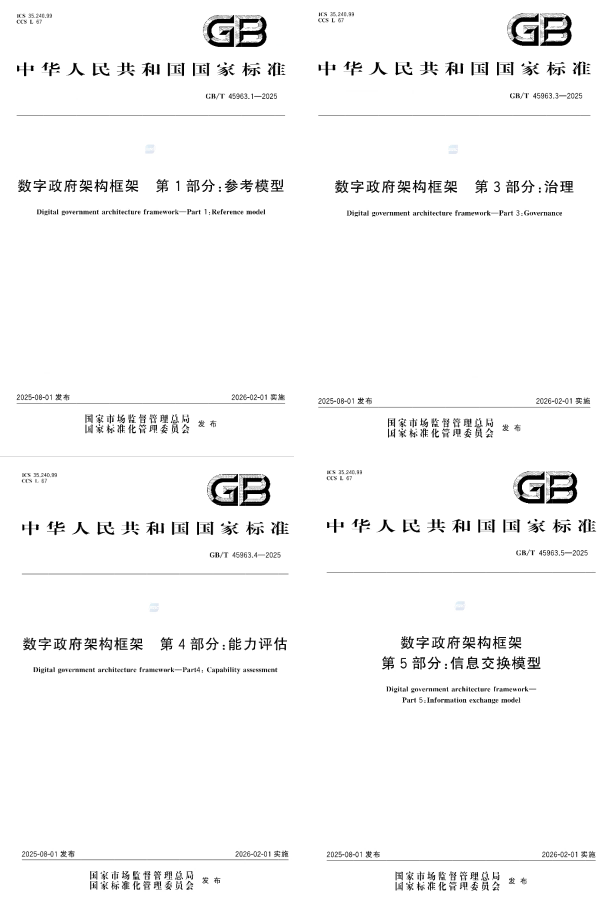 发布日期:2026-03-31 13:52 来源:综合业务处 字体:[ 大 中 小 ]近日,国家市场监督管理总局、国家标准化管理委员会发布GB/T 45963-2025《数字政府架构框架》系列国家标准。江苏省大数据管理中心充分发挥在数字政府建设领域的实践优势,作为核心起草单位深度参与第1部分:参考模型、第2部分:架构设计、第4部分:能力评估、第5部分:信息交换模型等四个部分的编制工作,将江苏在政务数据治理、跨部门协同等方面的探索经验转化为国家标准,为全国数字政府规范化建设贡献“江苏智慧”。该系列标准已于2026年2月1日起实施。